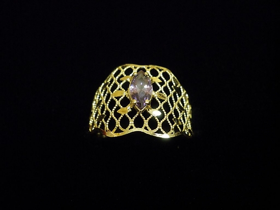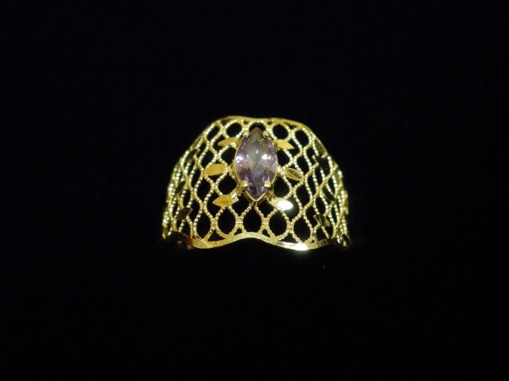 Златен пръстен с орнаменти от жълто злато и лилав камък