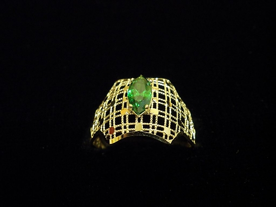 Златен пръстен с орнаменти от жълто злато и зелен камък,олекотен