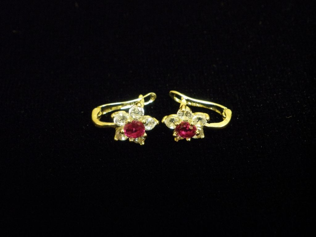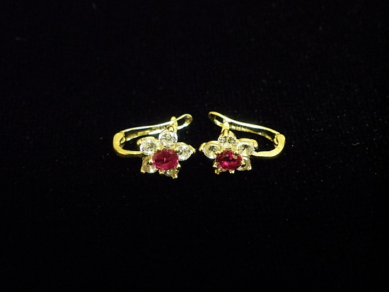 Златни детски обеци с бели и червени камъни,английско закопчаване