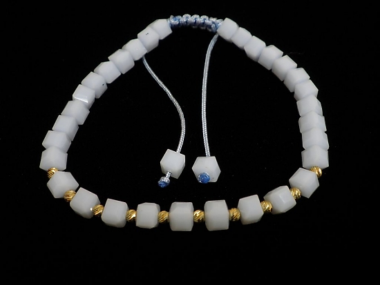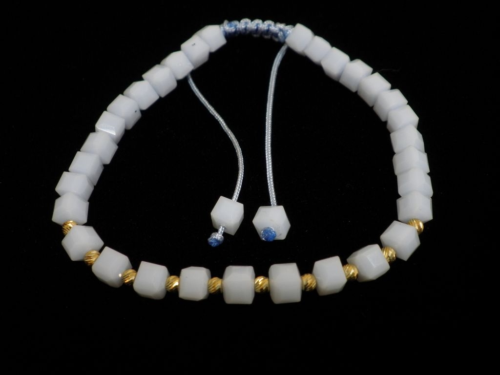 Златна гривна със светло син конец и светло сини квадратни мъниста