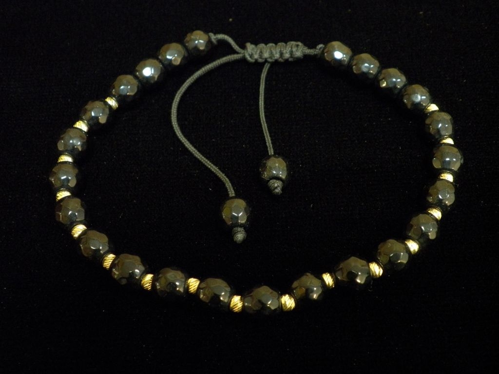 Златна гривна с черен конец и големи черни релефни мъниста