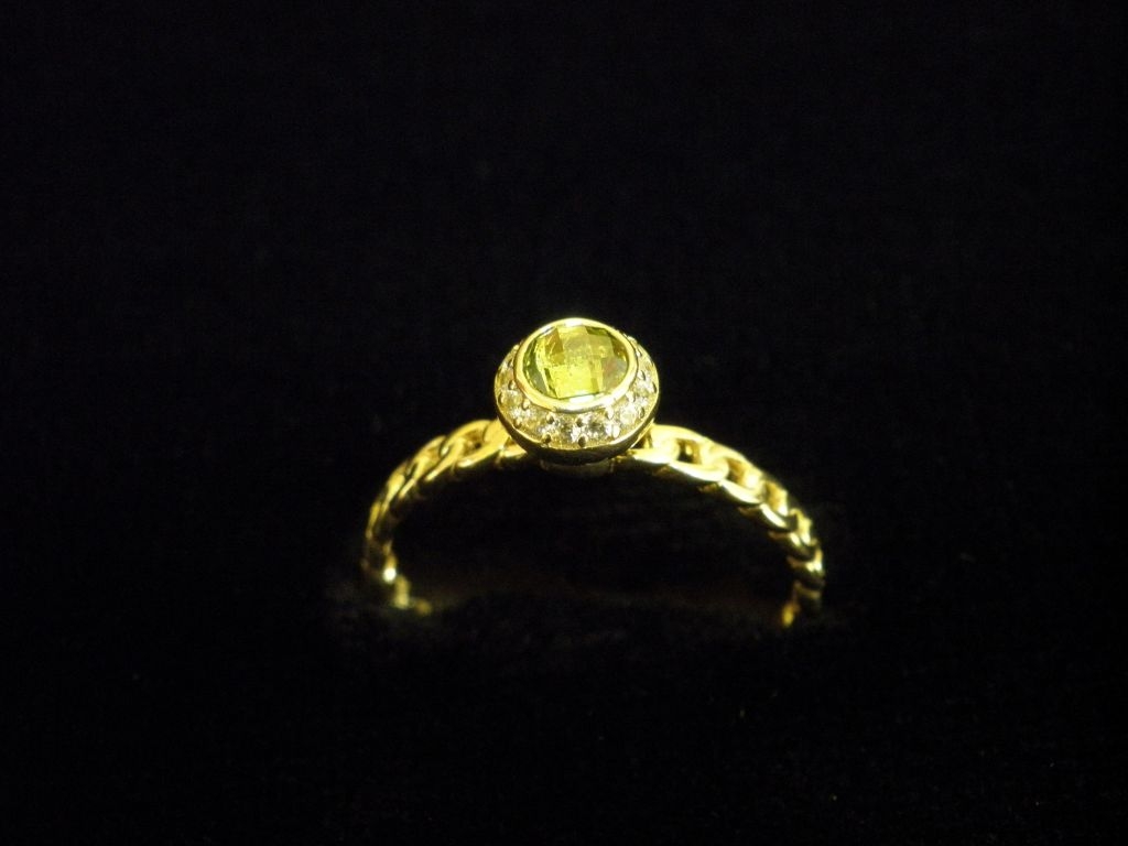 Златен пръстен със зелен и бели камъни