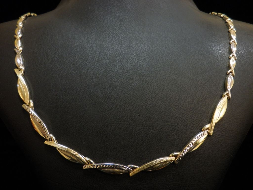 Златно колие с гравирани елементи от бяло и жълто злато,олекотено