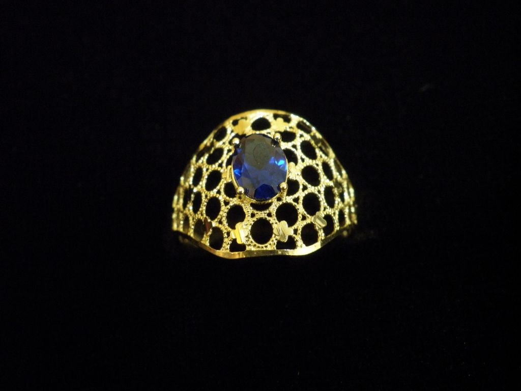 Златен пръстен с орнаментиот жълто злато и син камък,олекотен