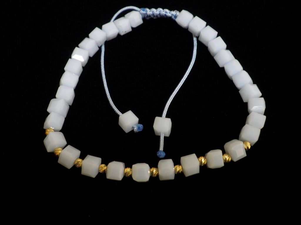Златна гривна със светло син конец и светло сини квадратни мъниста