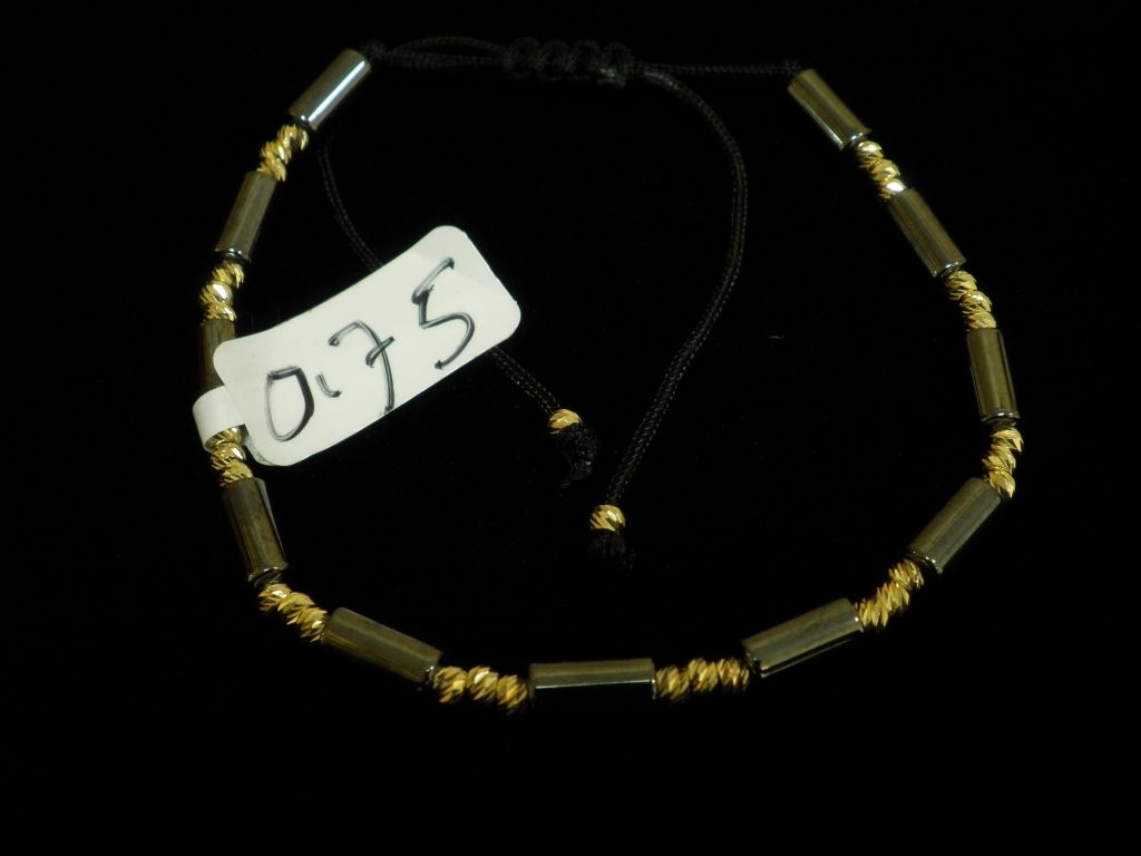 Златна гривна с черен конец и фигури сив металик