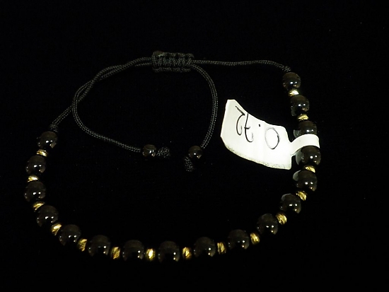 Златна гривна с черен конец и големи черни мъниста
