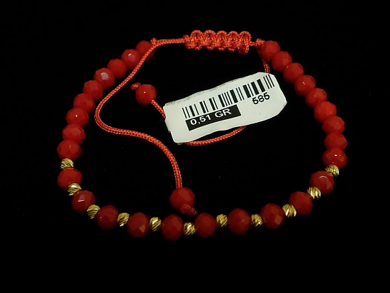 Златна гривна с червен конец и червени релефни мъниста