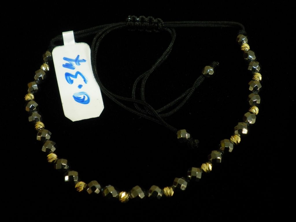 Златна гривна с черен конец и фигури сив металик