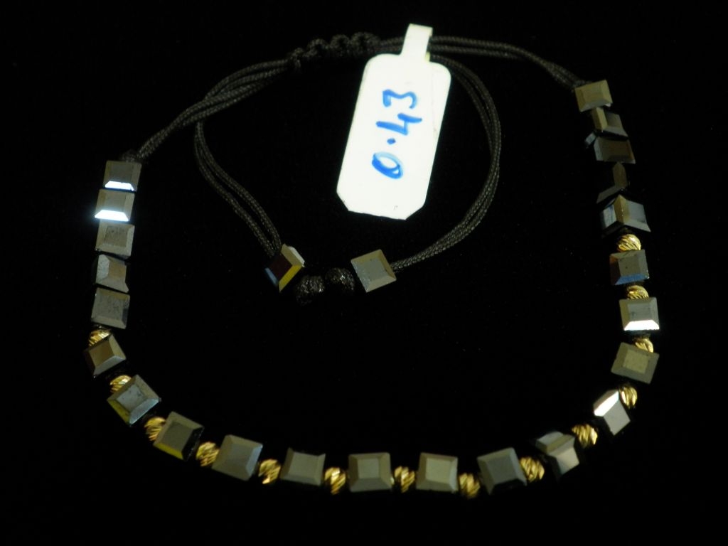 Златна гривна с черен конец и лилави квадратни мъниста
