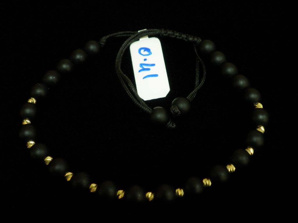 Златна гривна с черен конец и големи черни матирани мъниста