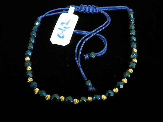 Златна гривна със син конец и сини релефни мъниста