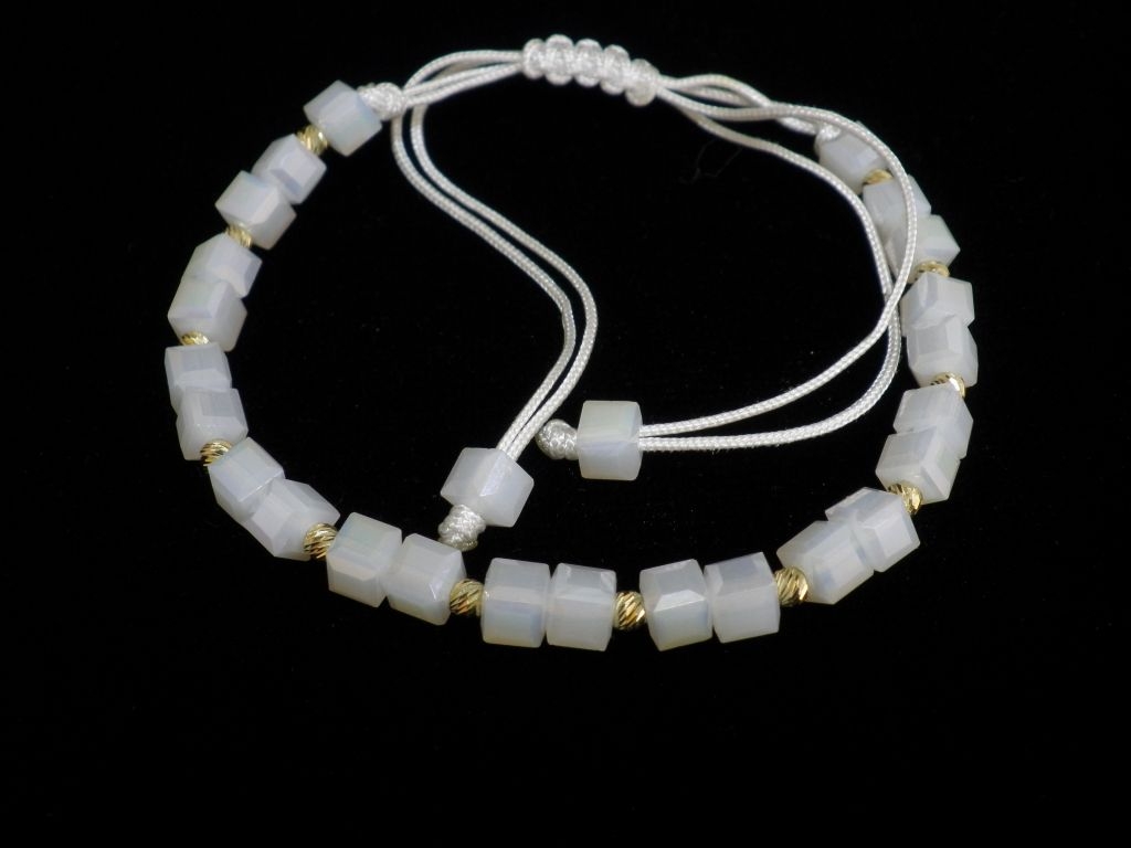 Златна гривна с бял конец и бели квадратни мъниста