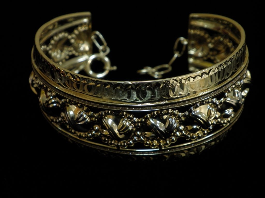 Златна твърда гривна с гравирано бяло и жълто злато