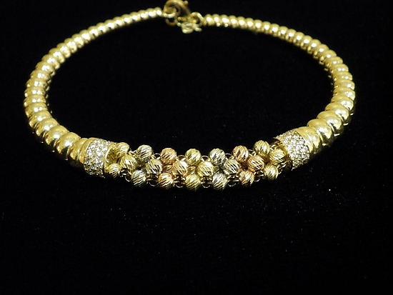 Златна твърда гривна с гравирани топчета от бяло,жълто и червено злато