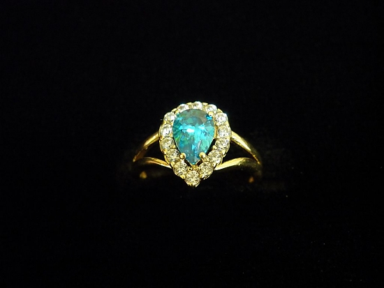 Златен пръстен със син и бели камъни