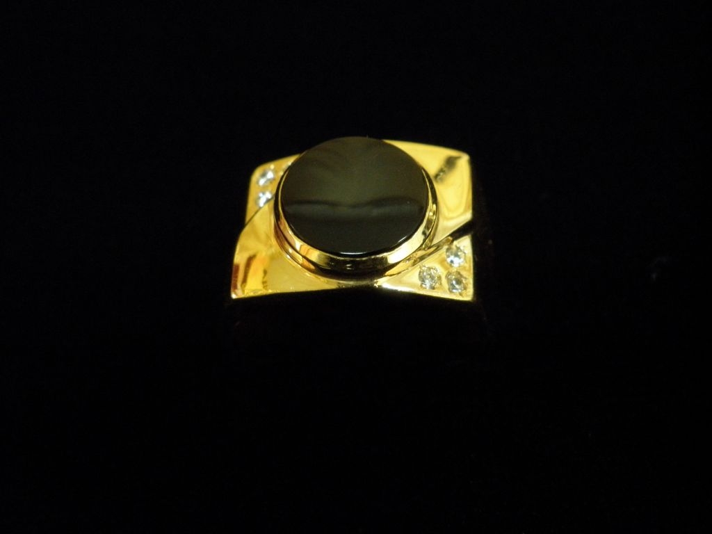 Златен пръстен с черна плочка и бели камъни