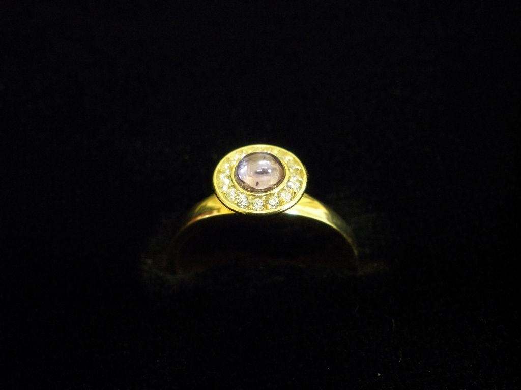 Златен пръстен с лилав и бели камъни