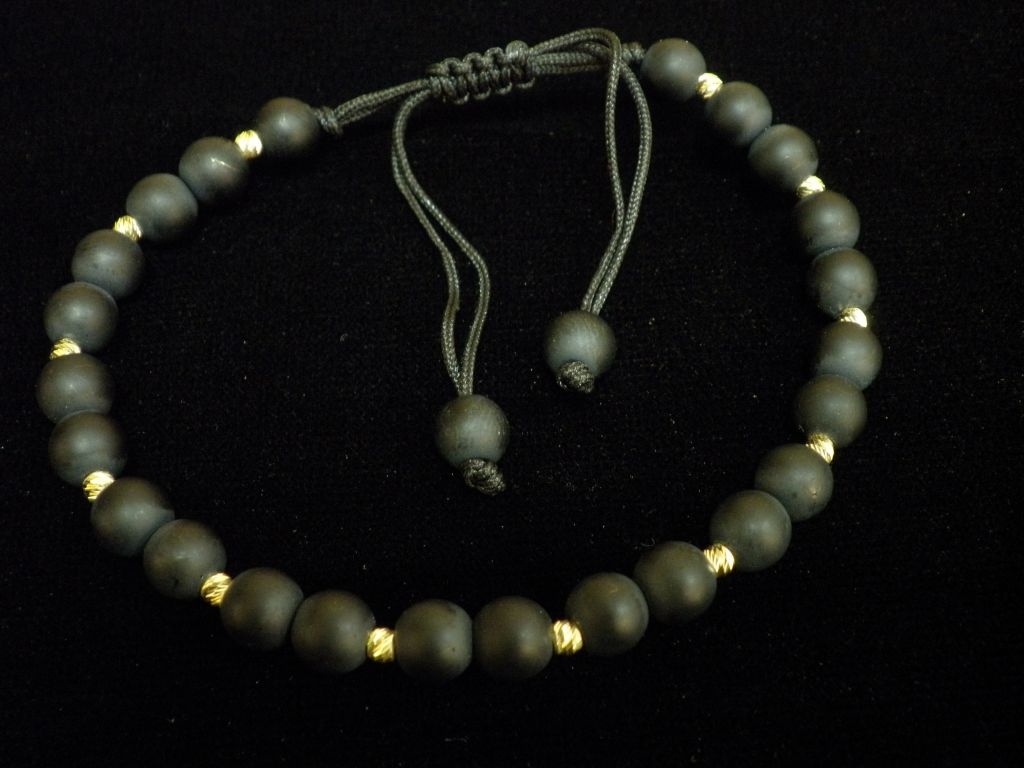 Златна гривна с черен конец и големи черни матирани мъниста
