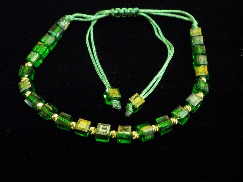 Златна гривна със зелен конец и зелени квадратни мъниста