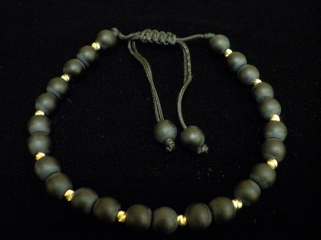 Златна гривна с черен конец и големи черни матирани мъниста