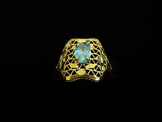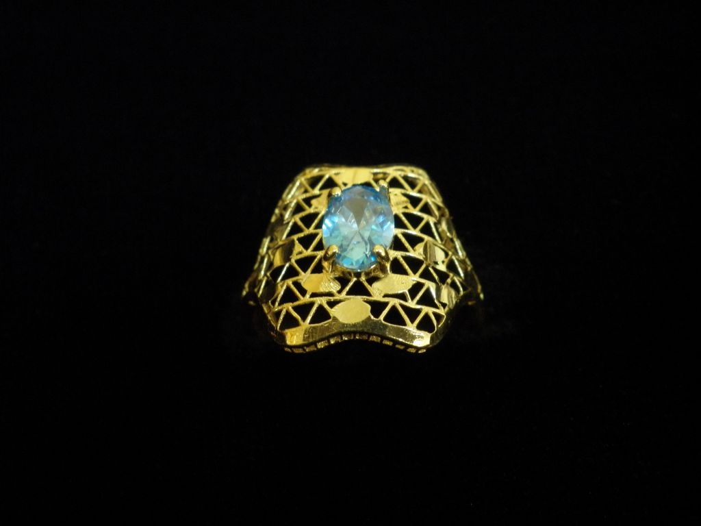Златен пръстен с орнаментиот жълто злато и син камък,олекотен