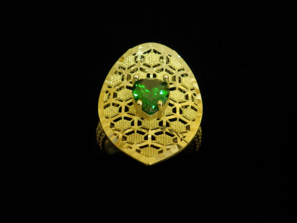 Златен пръстен с орнаменти от жълто злато и зелен камък,олекотен