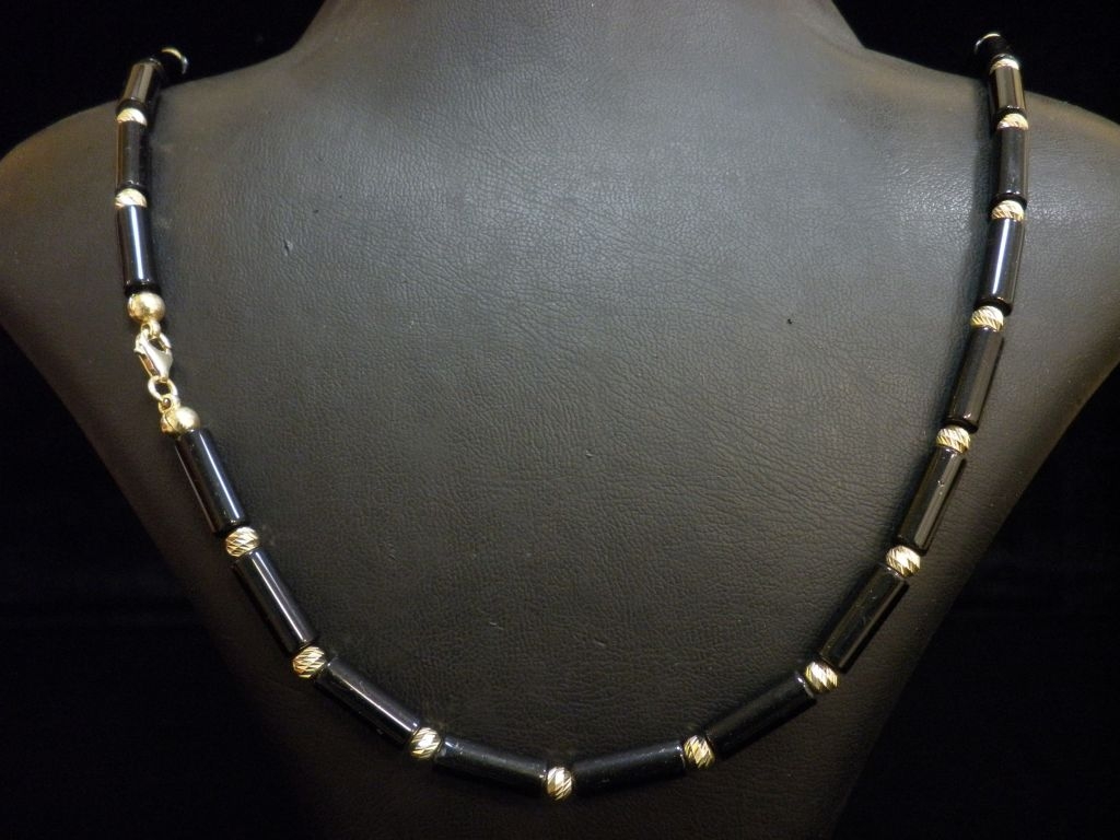 Златен синджир с гравирани топчета и черни мъниста