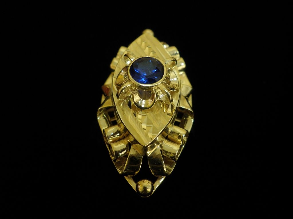 Златен пръстен с орнаменти от жълто злато и син камък