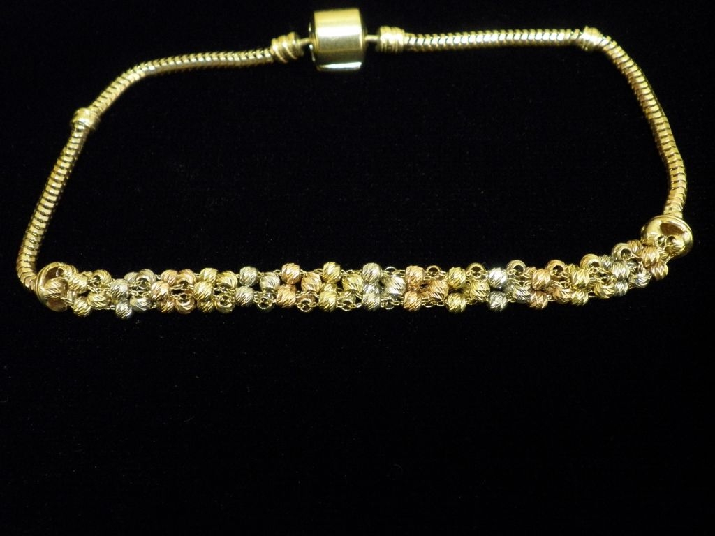 Златна синджирна гривна с гравирани топчета от бяло,жълто и червено злато