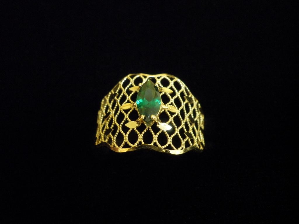 Златен пръстен с орнаменти от жълто злато и зелен камък