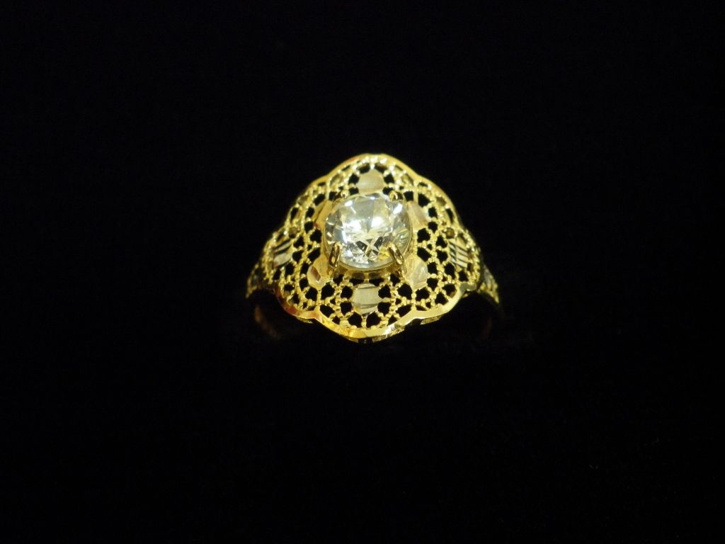 Златен пръстен с орнаменти от жълто злато и бял камък