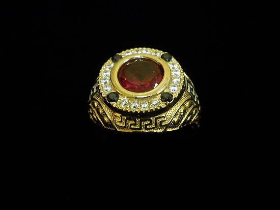 Златен пръстен с червен и бели камъни