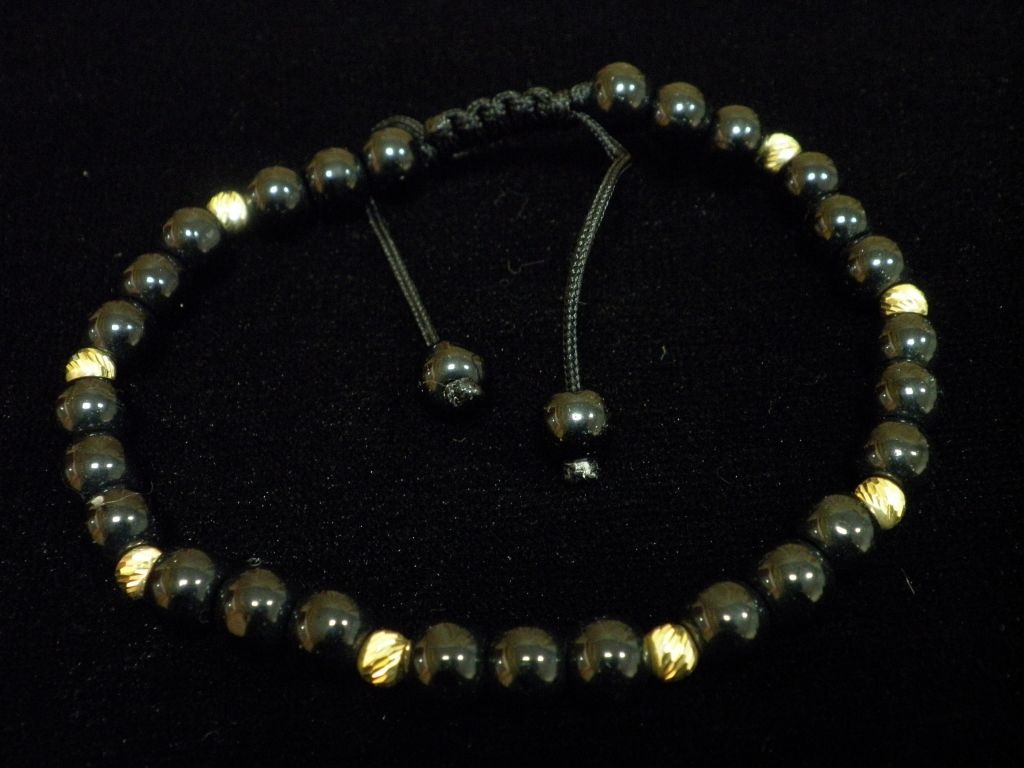 Златна гривна с черен конец и големи черни мъниста