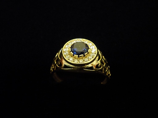 Златен пръстен със син и бели камъни