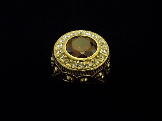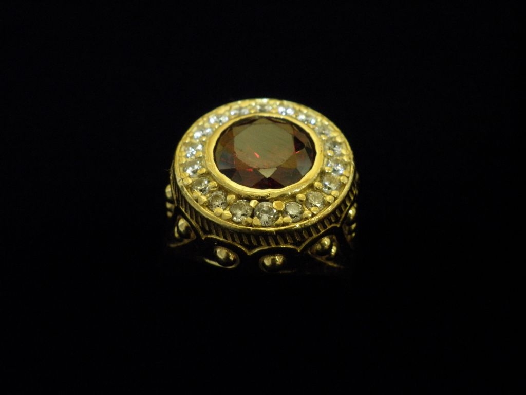 Златен пръстен с червен и бели камъни
