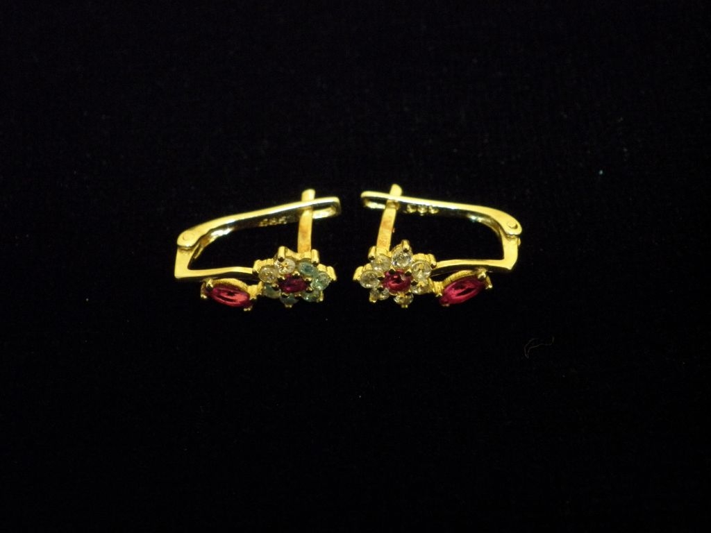 Златни детски обеци с бели и червени камъни,английско закопчаване